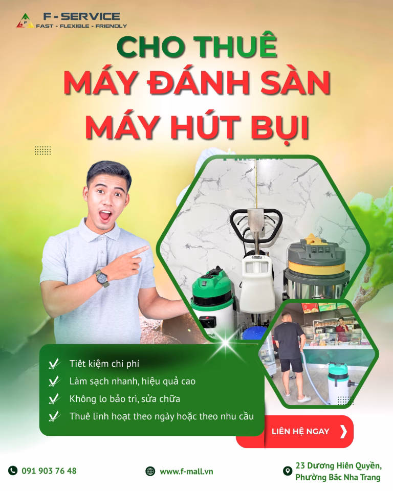 Cho thuê máy đánh sàn, máy hút bụi tại Nha Trang đang là dịch vụ được nhiều cá nhân và doanh nghiệp quan tâm, đặc biệt trong bối cảnh nhu cầu vệ sinh nhà xưởng, cửa hàng, khách sạn và các công trình vệ sinh ngắn hạn ngày càng tăng.